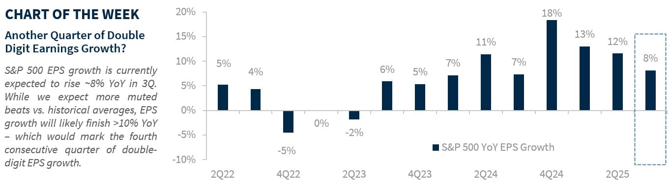 • Can Earnings Surpass A Higher Bar? | Companies face tougher expectations heading into this earnings season. Over the past 12 weeks, S&P 500 earnings estimates have ticked up 0.4%, compared to an average 3.2% cut over the last decade. Strong economic growth (Atlanta Fed GDPNow: +3.9%) should support more beats in 3Q, though these beats may be smaller than recent quarters (10-quarter average: +6.8%). However, we still expect the S&P 500 to notch its fourth consecutive quarter of double-digit earnings growth. Investors will likely focus more on top-line revenue growth than cost-cutting measures like layoffs. With valuations elevated, misses could be punished sharply—last quarter, companies that fell short lagged the broader market by 5.8% the next day by the widest margin since 2017.