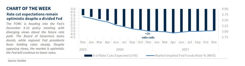 The Fed’s final meeting of 2025, on December 9–10, is just around the corner, and expectations are running high. Markets are assuming a third consecutive rate cut as signs of labor market weakness persist. Yet, beneath that near certainty lies an unusual public split within the FOMC. Recent dissents highlight the challenge of balancing a cooling job market against stubborn inflation—casting fresh uncertainty over the policy path for 2026. Adding to the intrigue is a looming leadership transition: Chair Jerome Powell’s term ends in May 2026, and the search for his successor is already underway. President Donald Trump has hinted that his choice is made and will be announced in early January. Below we preview the leading contender, Kevin Hassett, for the Fed’s top job, break down what to watch in the updated dot plot and economic projections, and explore what it all means for equity and fixed income markets.